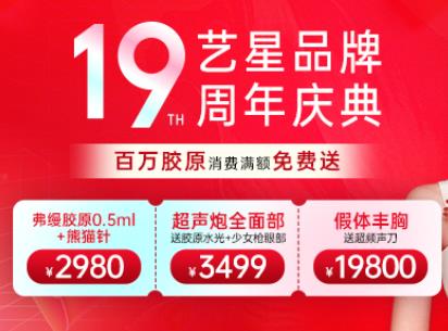 武漢藝星品牌19周年慶給大家?guī)砀@,百萬膠原消費(fèi)滿額免費(fèi)送,假體隆胸19800元送超頻聲刀。