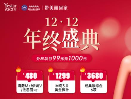 武漢藝星雙十二年終盛典美容優(yōu)惠福利來啦,外科項(xiàng)目99元抵1000元,海薇M+伊婉V+法思麗480元三選一,還有更多美容福利等著大家。