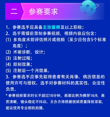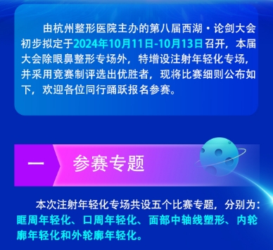 由杭州整形醫(yī)院主辦的第八屆西湖·論劍大會(huì)初步擬定于2024年10月11日-10月13日召開,本屆大會(huì)除眼鼻整形專場(chǎng)外,特增設(shè)注射年輕化專場(chǎng),并采用競(jìng)賽制評(píng)選出優(yōu)勝者,現(xiàn)將比賽細(xì)則公布如下,歡迎各位同行踴躍報(bào)名參賽。