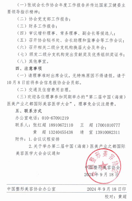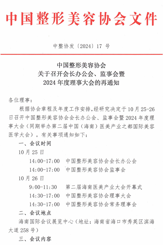 中國整形美容協(xié)會關(guān)于召開會長辦公會、監(jiān)事會暨2024 年度理事大會的再通知。經(jīng)研究決定于10月25-26日召開。