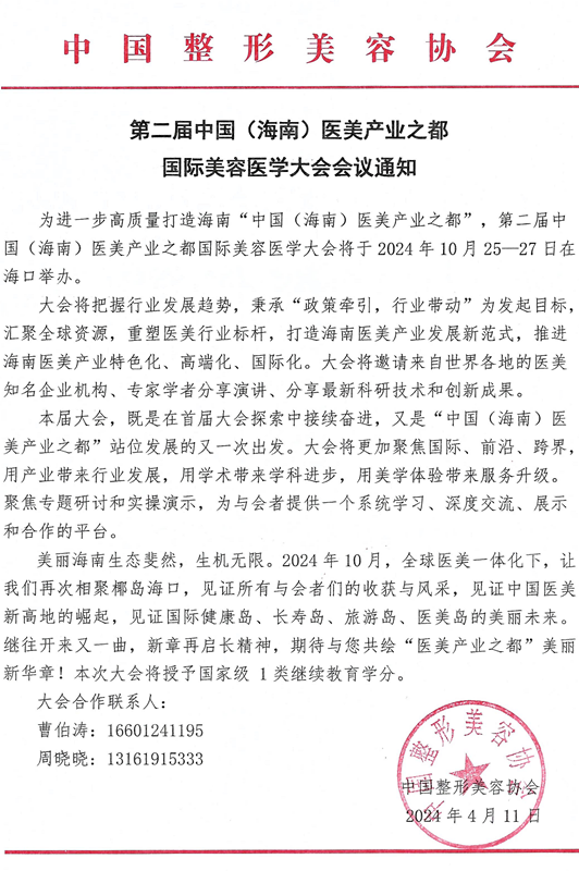 根據(jù)協(xié)會章程及年度工作安排,經(jīng)研究決定于10月25-26日召開中國整形美容協(xié)會會長辦公會、監(jiān)事會暨2024年度理事大會(同期舉辦第二屆中國(海南)醫(yī)美產(chǎn)業(yè)之都國際美容醫(yī)學(xué)大會)。有關(guān)事項通知如下: