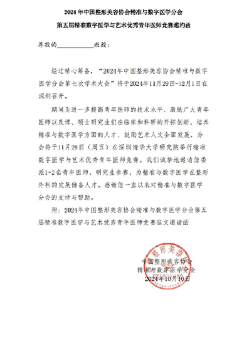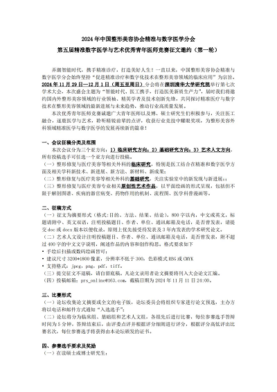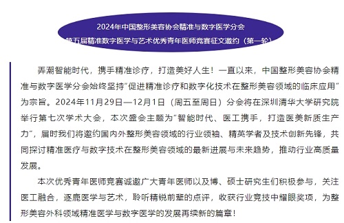 2024年中國整形美容協(xié)會(huì)精準(zhǔn)與數(shù)字醫(yī)學(xué)分會(huì)第五屆精準(zhǔn)數(shù)字醫(yī)學(xué)與藝術(shù)優(yōu)秀青年醫(yī)師競賽征文邀約(第一輪)