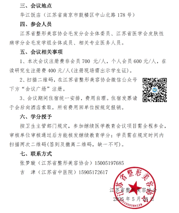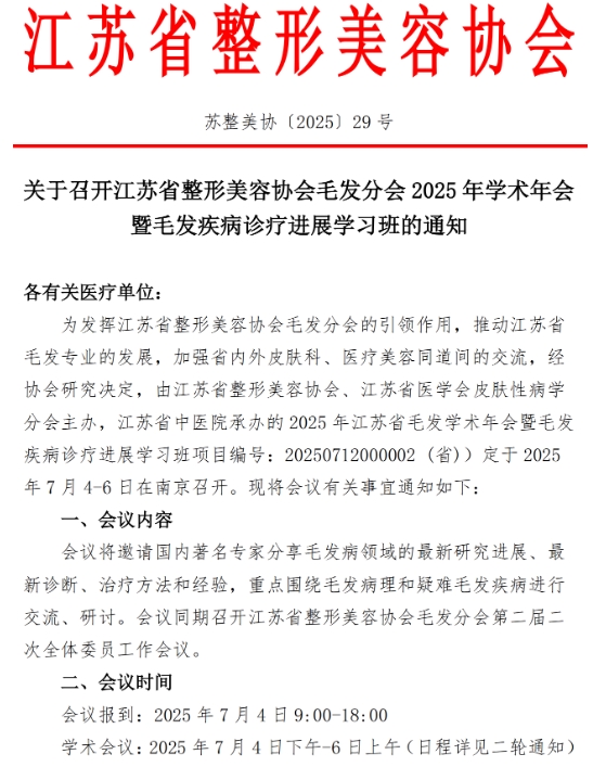 由江蘇省整形美容協(xié)會、江蘇省醫(yī)學會皮膚性病學分會主辦,江蘇省中醫(yī)院承辦的2025年江蘇省毛發(fā)學術(shù)年會暨毛發(fā)疾病診療進展學習班定于2025年7月4-6日在南京召開。