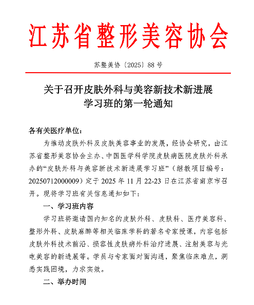 為推動皮膚外科及皮膚美容事業(yè)的發(fā)展,經(jīng)協(xié)會研究,由江蘇省整形美容協(xié)會主辦、中國醫(yī)學科學院皮膚病醫(yī)院皮膚外科承辦的“皮膚外科與美容新技術新進展學習班”定于2025年11月22-23日在江蘇省南京市召開。